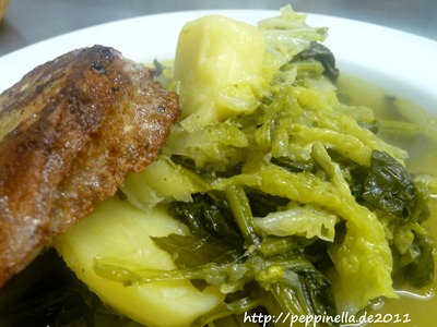 Während die Minestra vor sich hin köchelt, reibe ich schon mal den Käse. Auftritt Herr Peppinello “Schrägstrich” - 1.Akt. Rapa findet er grundsätzlich lecker. Mit Salsiccia. Oder wenigstens mit Speck. Sagt er. Und ich sage, ich weiß, kommt aber gar nicht in die Tüte. Wir sind katholisch und ziehen das jetzt durch.